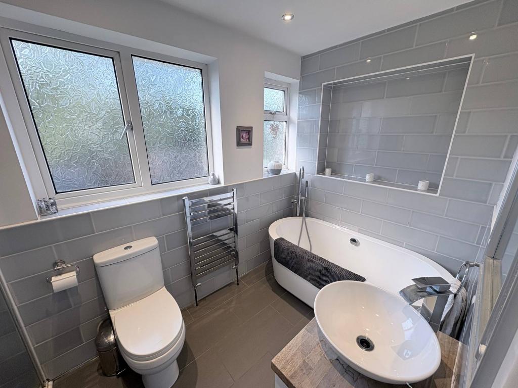 Upstairs, the property features three bedrooms and a family bathroom, complete with both a separate shower and a bath.