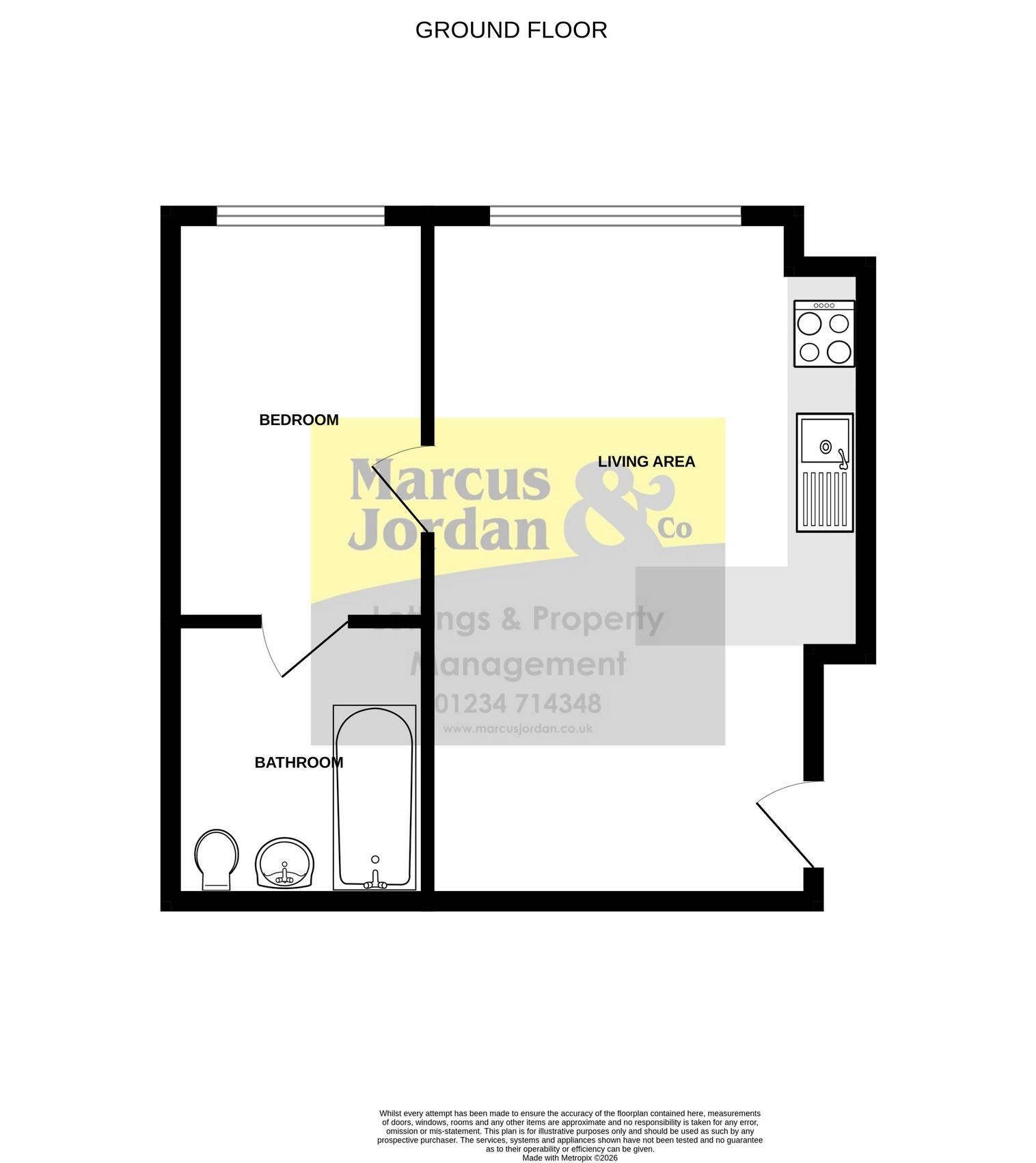 The apartment also features one good-sized bedroom and a bathroom with a shower over the bath.